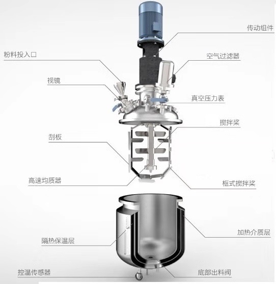 物料在乳化机的均质锅内通过锅内搅拌框上的聚四氟乙烯刮板(刮板始终迎合锅体内壁,扫净挂壁粘料),不断产生新界面,再经过框式搅拌器及与其反向的搅拌叶,将物料剪断、压缩、折叠,使其搅拌、混合而向下流往锅体下方的均质器处,再通过高速旋转的转子与定子之间所产生的剪断、冲击、乱流等过程使物料在剪切缝中被切割,迅速破碎成200nm~2μm的微粒。物料微粒化、乳化、混合、调匀、分散等可于短时间内完成。由于均质锅内处于真空状态,物料在搅拌过程中产生的气泡被及时抽走,实验室乳化机均质结束后升高锅盖,按下倾倒按钮开关可使锅内物料排向锅外容器内(或者打开锅底阀及加压阀门直接排料)。